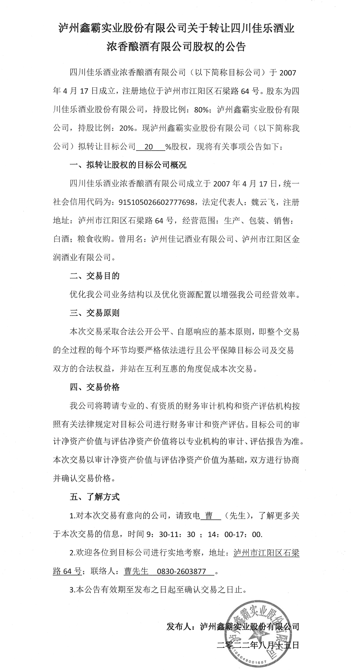 瀘州鑫霸實業(yè)股份有限公司關(guān)于轉(zhuǎn)讓四川佳樂酒業(yè)濃香釀酒有限公司股權(quán)的公告